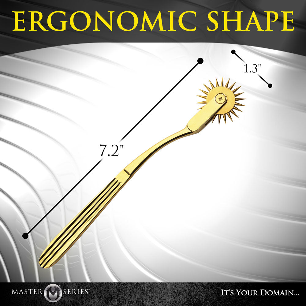 Wake up your partner's senses with this Wartenberg wheel! The shining, golden, wheel of needles are blunt enough to use on the skin but prickly enough to heighten sensation and give them goosebumps across their flesh! Use it during sensation-play and in kinky scenes to add another layer of desire-invoking teasing! The wheel was originally used in the medical industry to test nerve reflexes; now, you can watch your partner's body light up with sensation as they melt in your hands while you send tingles down their spine, their legs, their arms, their chest… Use it gently. If you want to switch it up and add some pain, drag the wheel sideways across the skin to scrape them or smack them with it. Never use it near the eyes and be careful around the more sensitive glands between the thighs. To clean after use, wash with soap and water, spray with a toy cleaner, or boil in hot water.