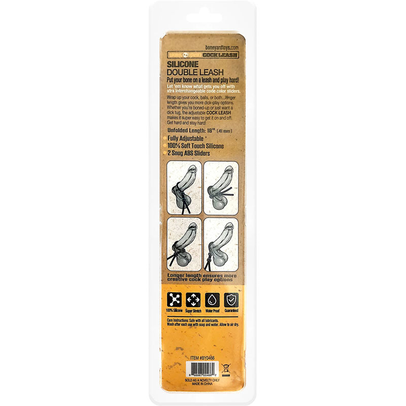 The Boneyard Cock Leash Double is the perfect cock ring, fully adjustable and easy to put on. The leash is 100% medical grade silicone. The two colour coded ABS latches (black, blue, red and yellow) allow for endless adjustment possibilities, and the added hint of your fetish to the lucky guy that gets your clothes off. The beads also let you loosen of tighten the ring without the hassle of changing to a different ring and losing your stiffy. The Cock Leash Double fits around your shaft, your balls, or both.