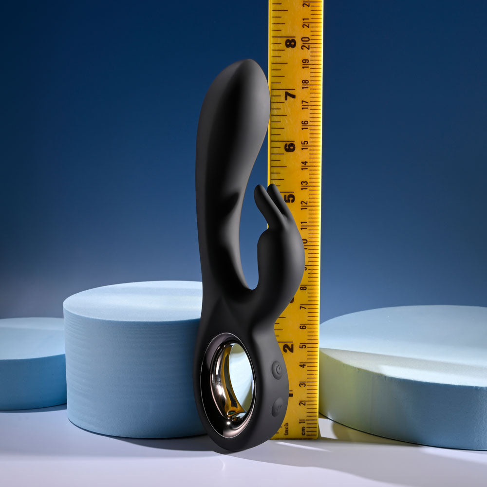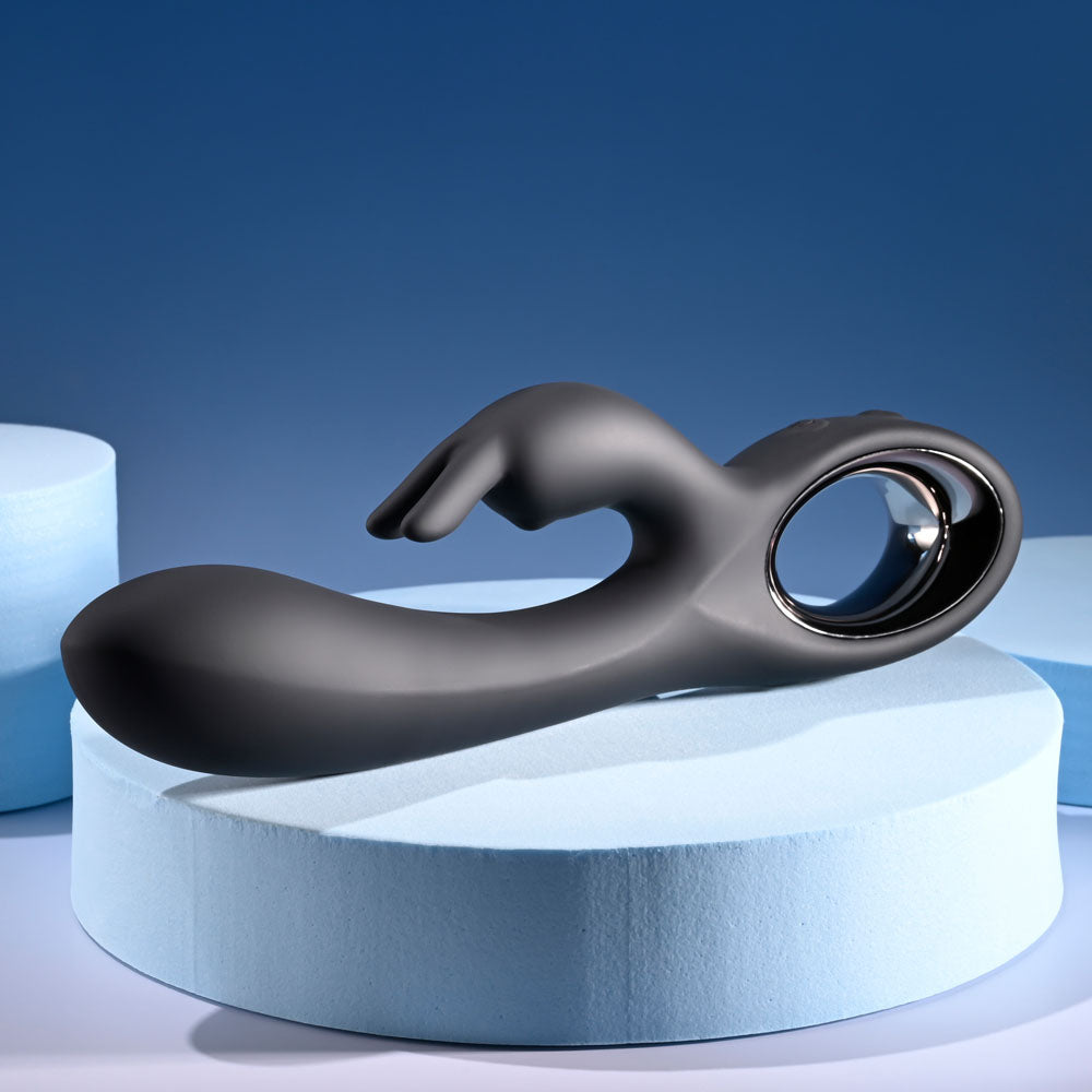 Late Night Bunny is the perfect excuse to call it a night! This powerful dual Vibrator is always ready for a late-night booty call with its 2 state-of-the-art motors that work independently for a custom dual experience – one in the gently curved swelling main shaft, and one in the hard-working rabbit. Made from sleek black body-safe silicone with a stylish and comfortable chrome ring handle, both shafts are flexible to move in harmony with your body. Discover the pleasures that await you after dark!