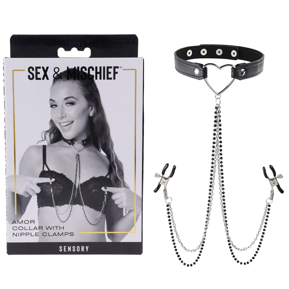 Introduce the teasing torment of nipple play to your next scene with the Amor Nipple Clamps. Equipped with tension adjustments, you or your partner can easily control the pleasure and the pain. The heart choker adds a delectably romantic touch to this BDSM must-have.