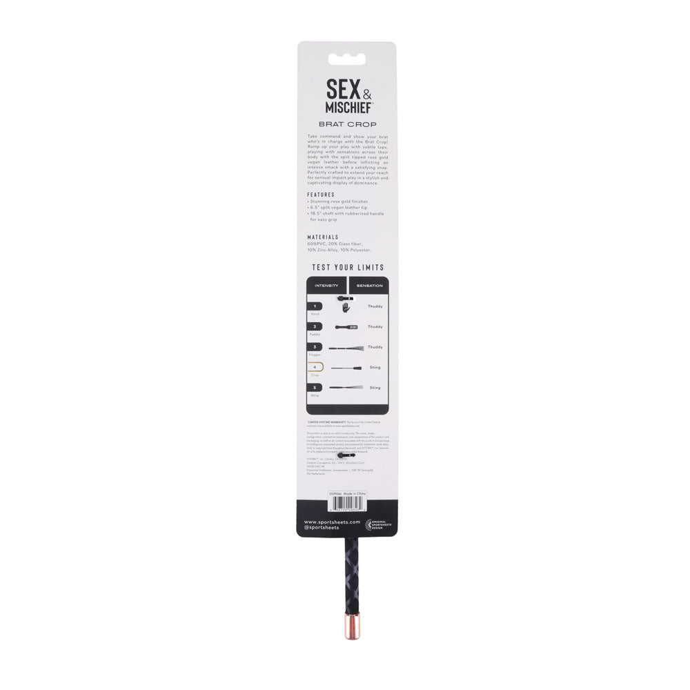 Take command and show your brat who’s in charge with the Brat Crop! Ramp up your play with subtle taps, playing with sensations across their body with the split tipped rose gold vegan leather before inflicting an intense smack with a satisfying snap. Perfectly crafted to extend your reach for sensual impact play in a stylish and captivating display of dominance.